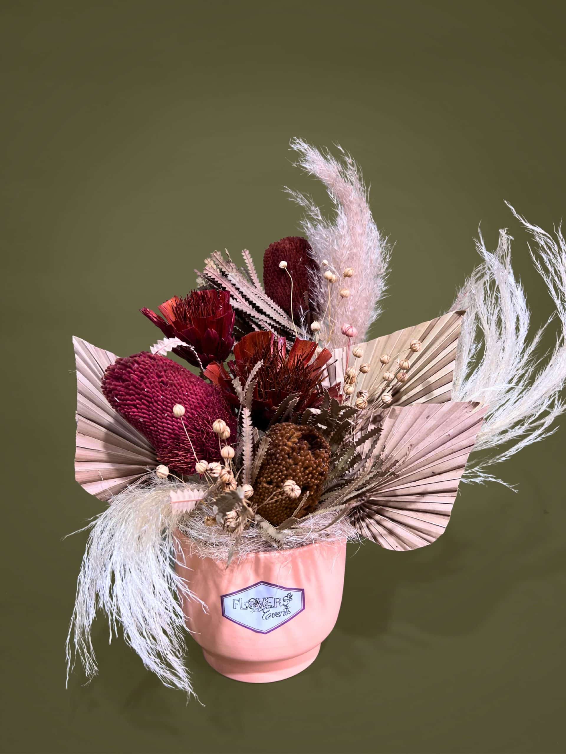 Acest produs contine: protea uscata, pampas, frunze de palmier, vas ceramica, flori uscate si alte elemente. Culoarea, nuanta florilor pot suferi mici modificari in functie de disponibilitatea florilor.