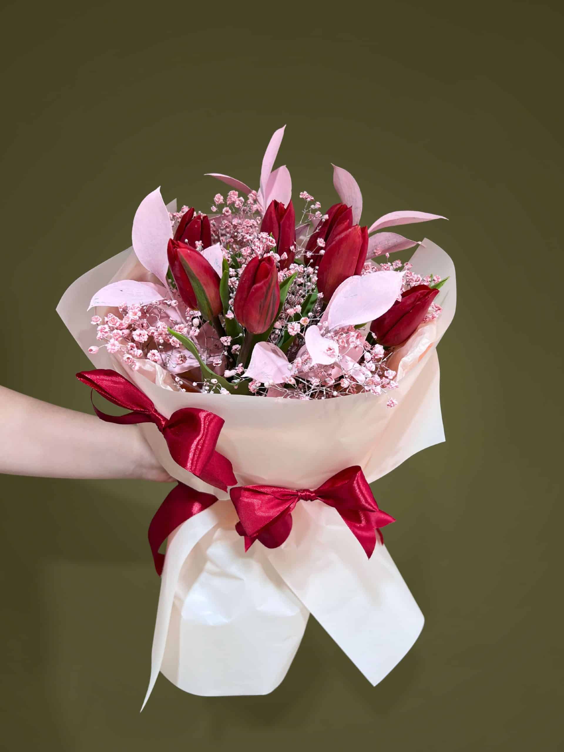 Buchet cu 7 lalele rosii si gypsophilla roz