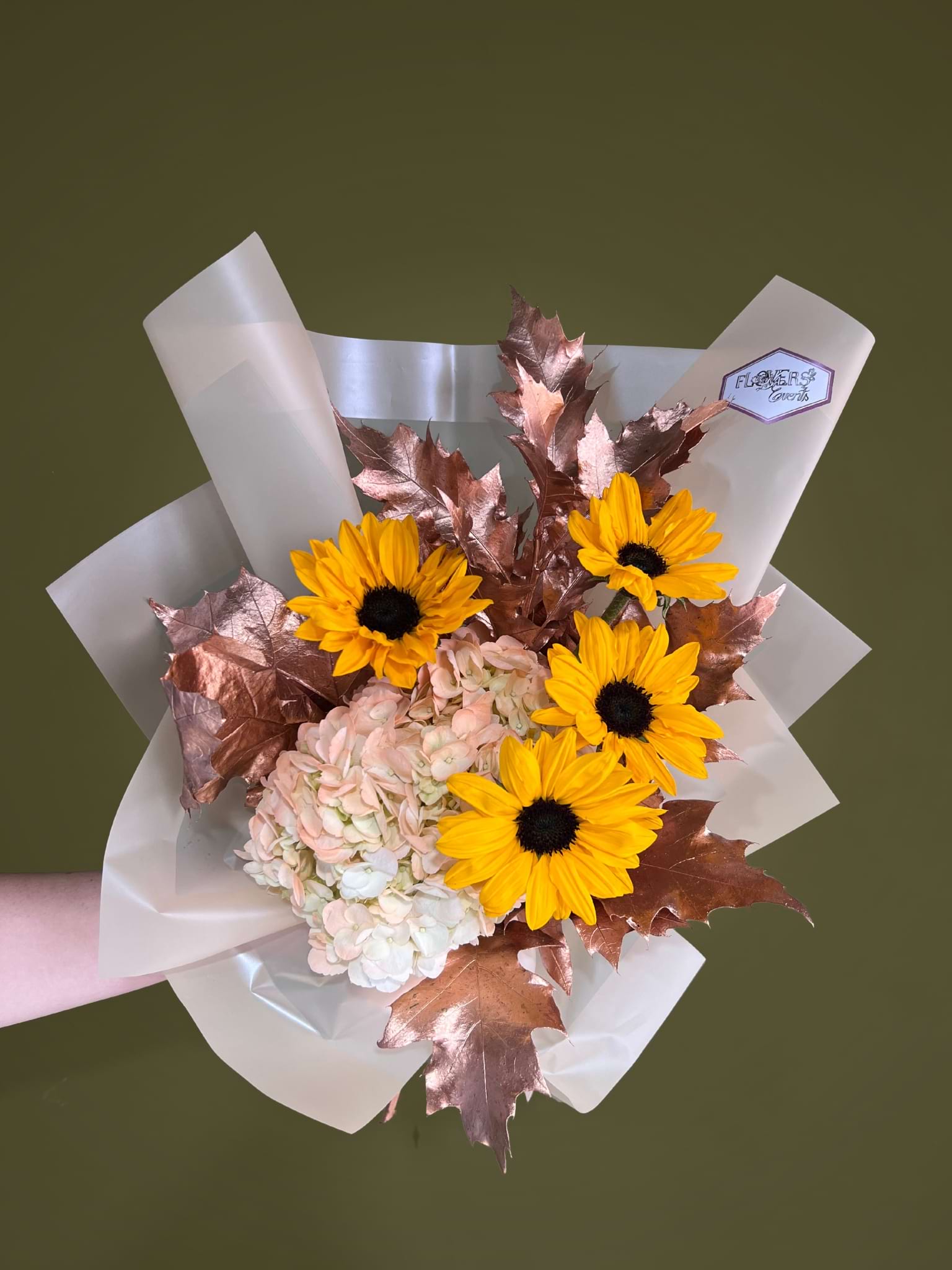 Acest produs contine: 1 hortensie, 4 floarea soarelui mini, 2 quercus, ambalaj si panglica.