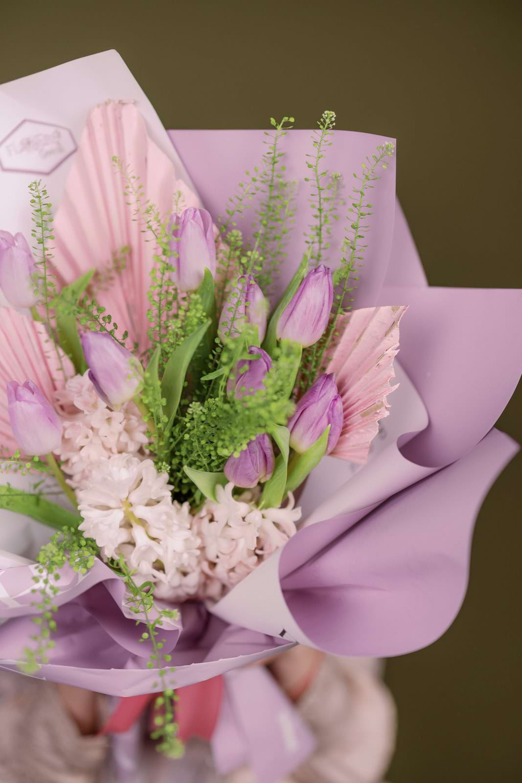 Acest produs contine: 9 lalele, 3 zambile, 2 lepidium, 3 frunze palmier, ambalaj, panglica si alte elemente.