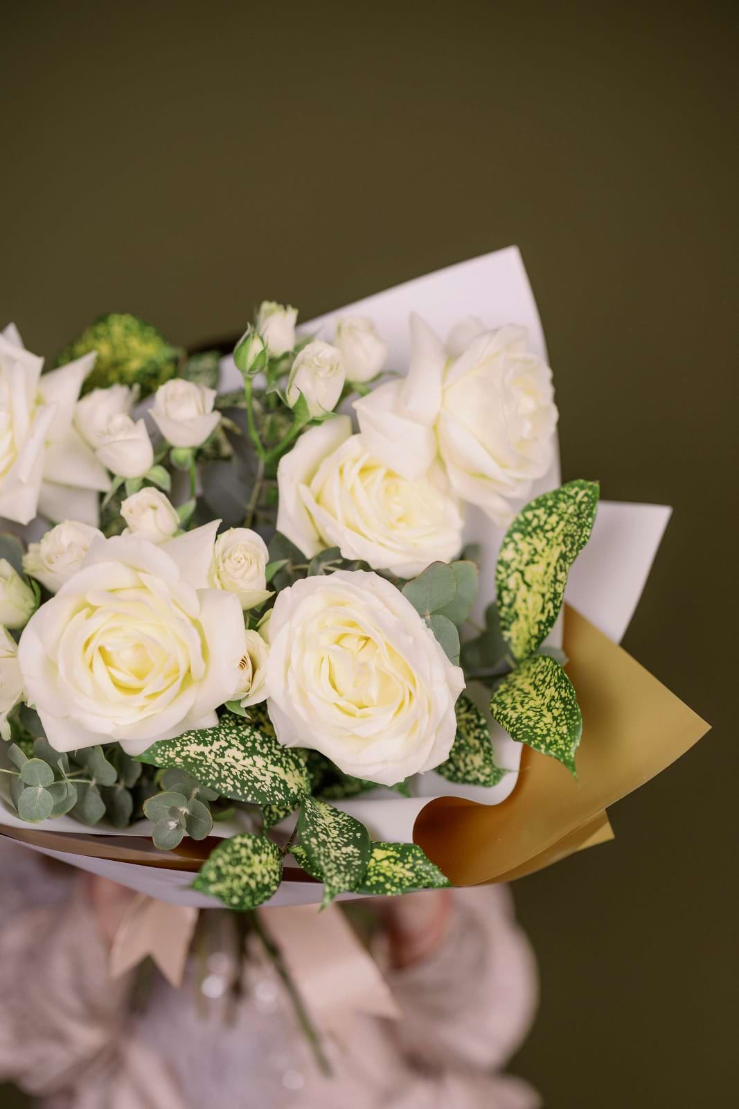 Acest produs contine: 5 trandafiri, 4 minirose, 4 florida beauty, eucalypt, ambalaj, panglica si alte elemente.