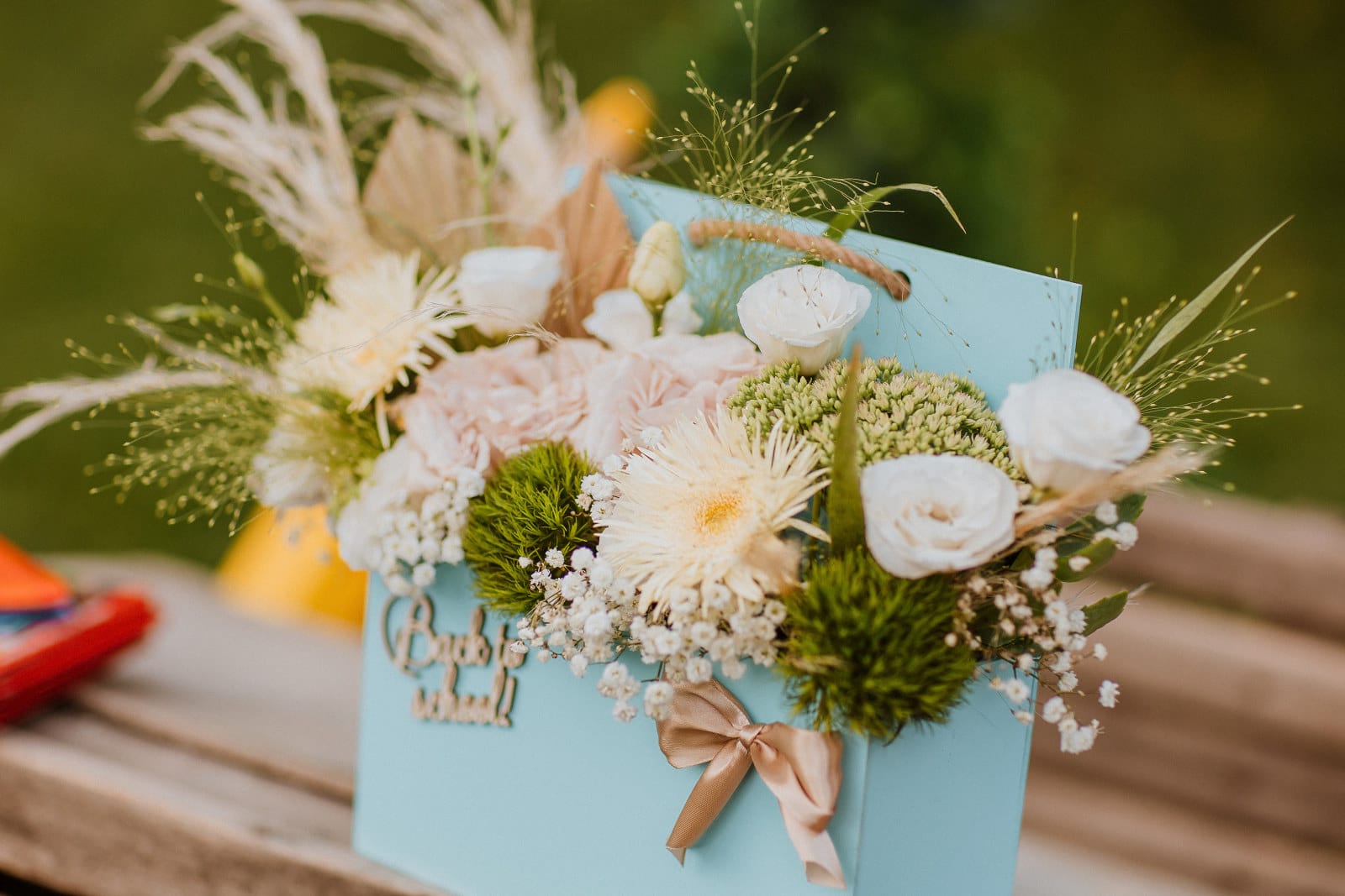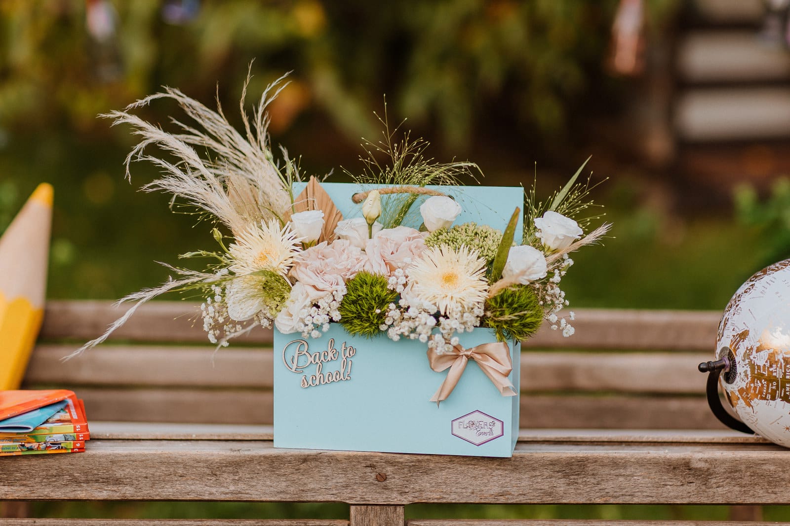 Acest produs contine: cutie ghiozdan mare, 2 minigerbera, 2 trandafiri, 2 dianthus, pampas, frunze palmier, 1 eustoma, 1 gypsophilla, 3 panicum, sedum si alte materiale.