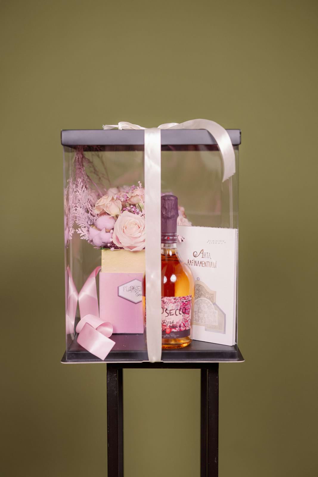 Acest produs contine: gift box, Prosecco Doc Rose 750 ml, carte Arta Rafinamentului, Aranjament in cutie cu 3 trandafiri, 4 minirose, 3 bumbac, conifer, gypsophilla si alte elemente.